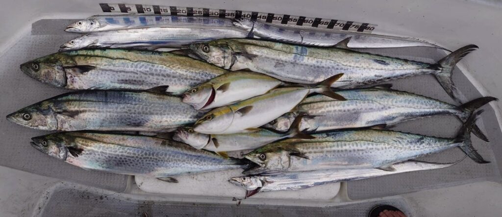 反応しばしば跳ねほぼ無し、お祭りのような時間は無かったものの皆さんの根気強いキープキャストでサワラ全員2本!最大94cm、タチウオとイナダのおまけつき!